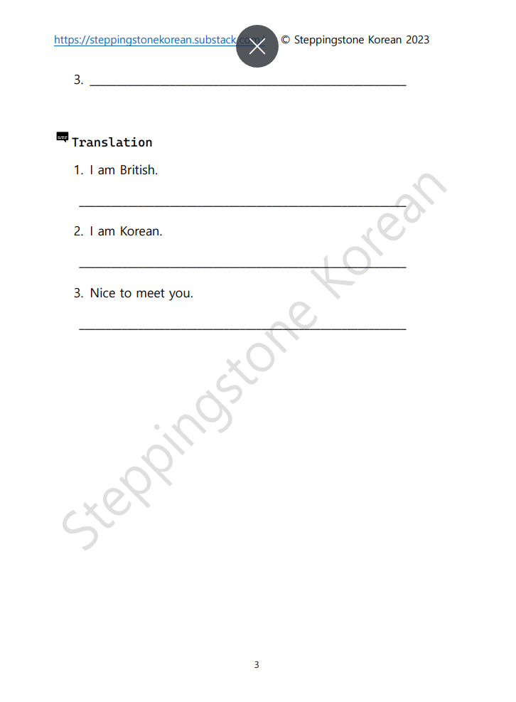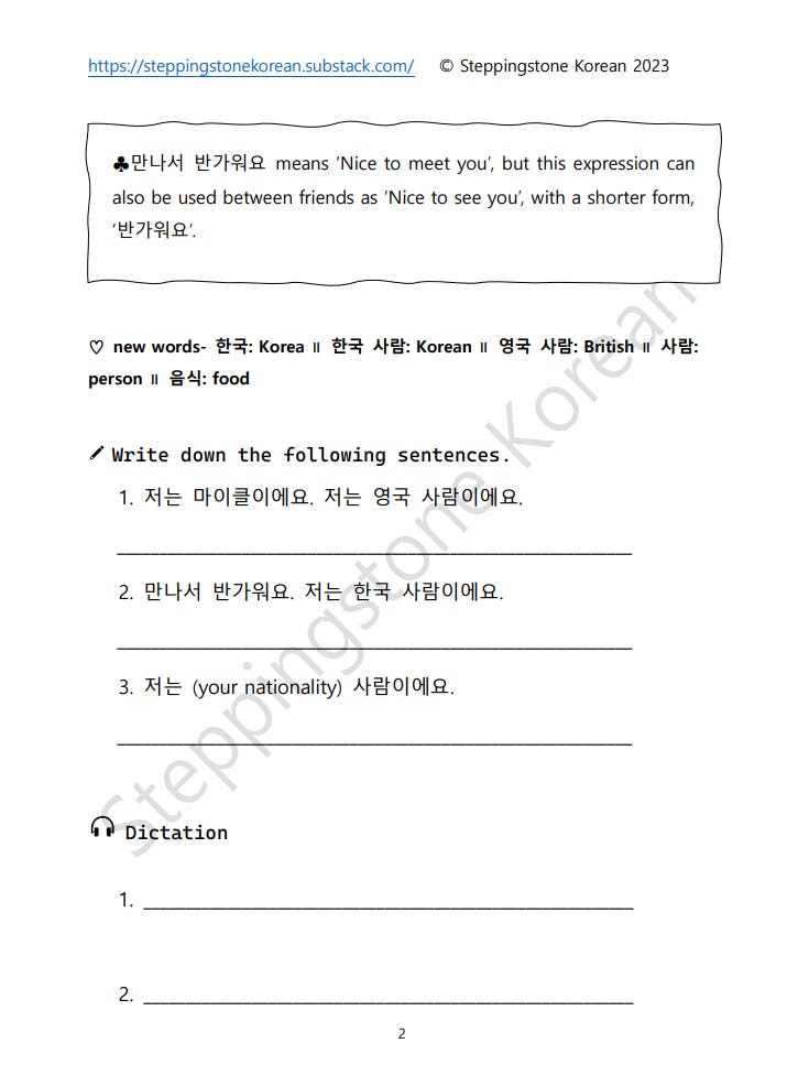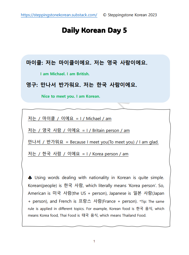 Daily Korean[Daily Korean] Day 5 - 저는 한국 사람이에요.Korean Language CenterNov 07, 20231ShareThis audio file includes today’s dialogue, new words, and dictation. Practice and fill in the blanks. You can also download the pdf file at the bottom. If you have any questions about today’s dialogue, please leave a comment. 감사합니다♡0:00-1:38Audio playback is not supported on your browser. Please upgrade.Daily Korean Day 5214KB ∙ PDF fileDownloadDownloadThanks for reading Steppingstone Korean! Subscribe for free to receive new posts and support my work.Subscribe